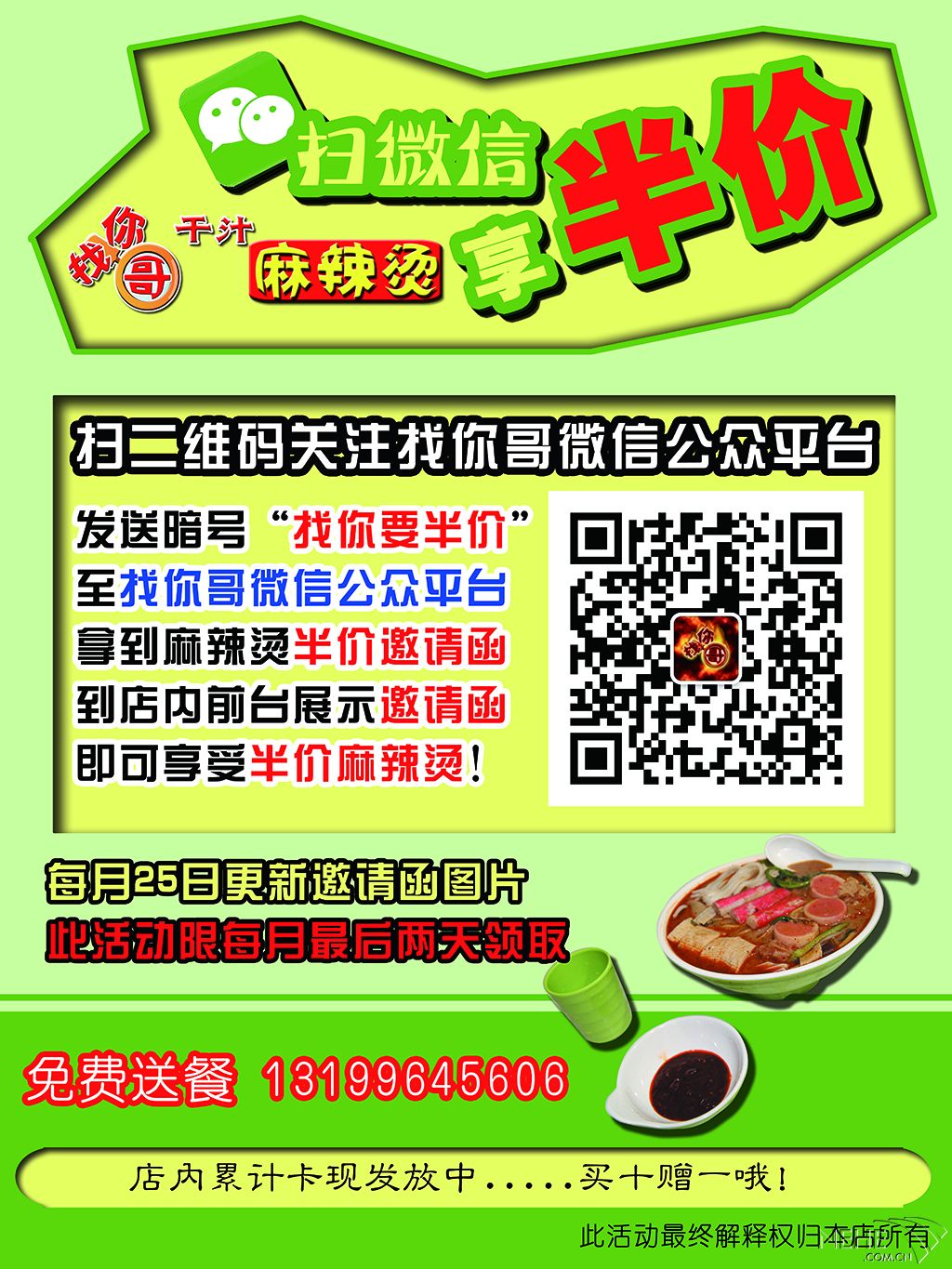 现在开始关注找你哥微信公众平台,就有机会获得麻辣烫半价优惠哦! 参加方式:1 扫描店内海报上的二维 ...