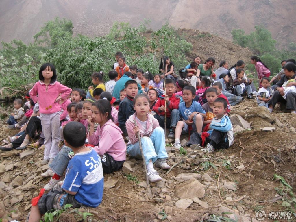 从王家崖滑坡中逃生的部分曲山小学、幼儿园娃娃。廖明艳的儿子就被埋在滑坡泥土下面……(图片说明:勒克儿;图:王刚摄于16:34分)