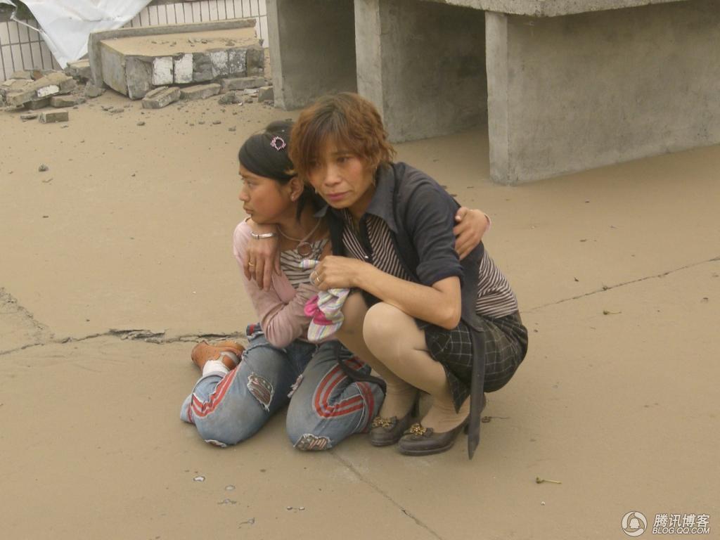大地还在剧烈颤抖,逃出废墟的母女俩躲进学校操场相互偎依惊恐万状(图片说明:勒克儿;图:刘汉希望学校教师 李兴奎 摄于2008-5-12 14:42)